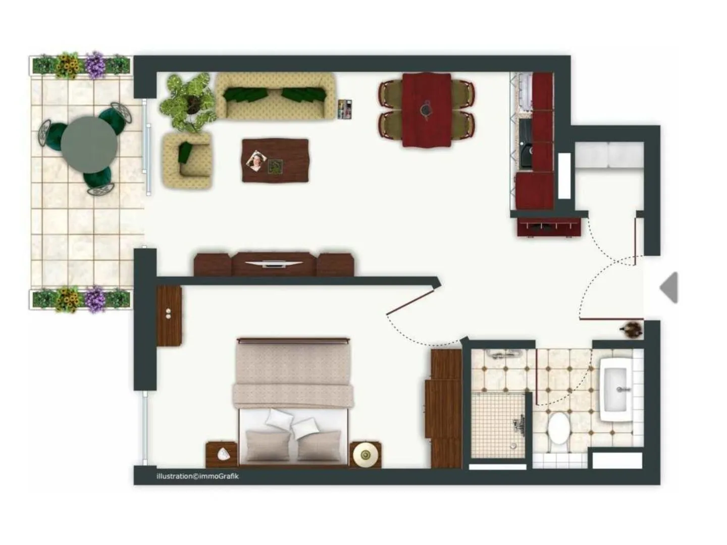 Von diesem Wohnzimmer aus gelangen Sie direkt auf die sonnige Terrasse in Südlage, die mit einer kleinen Sitzgarnitur zum Entspannen und Genießen der frischen Luft einlädt.
