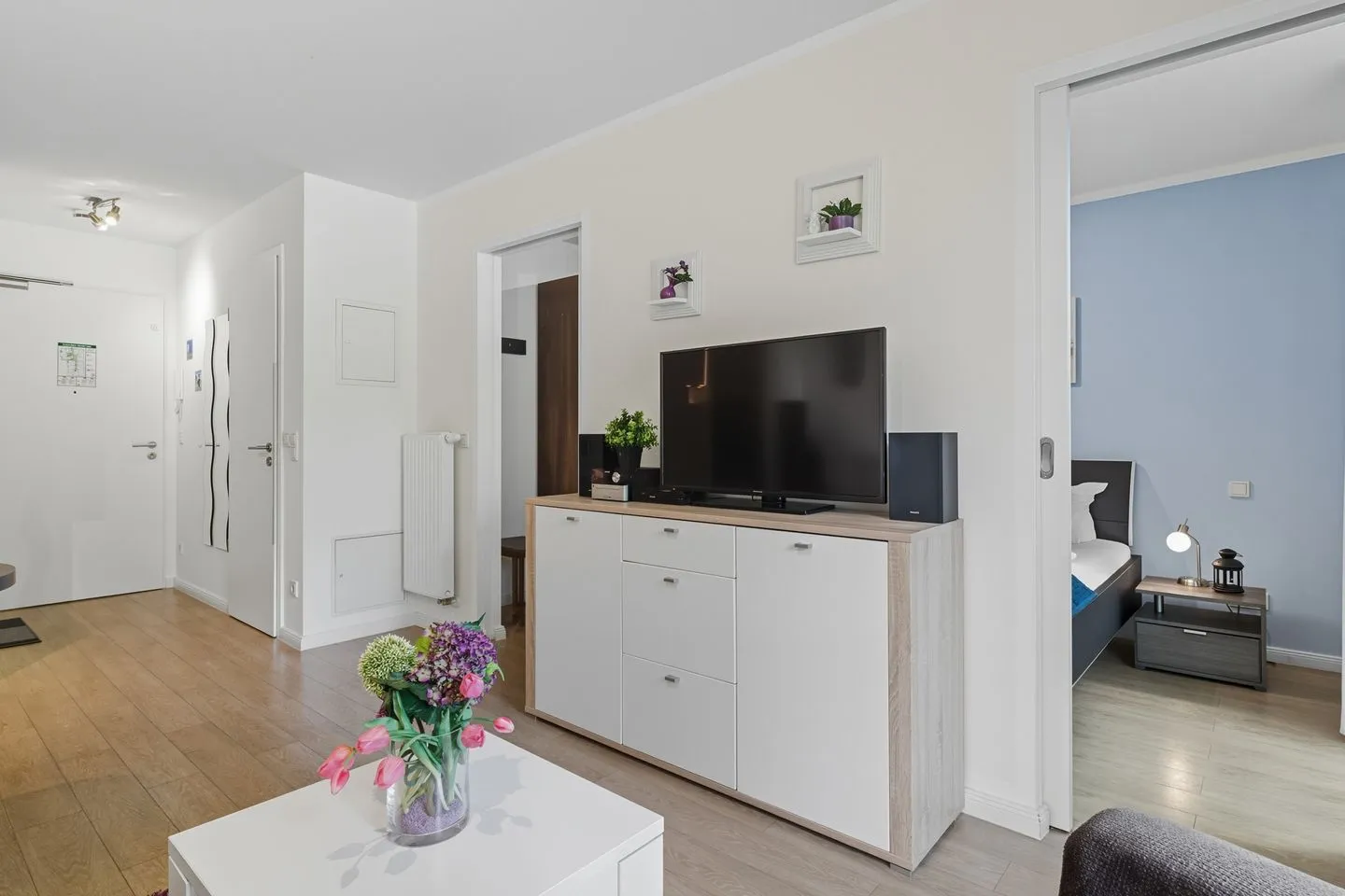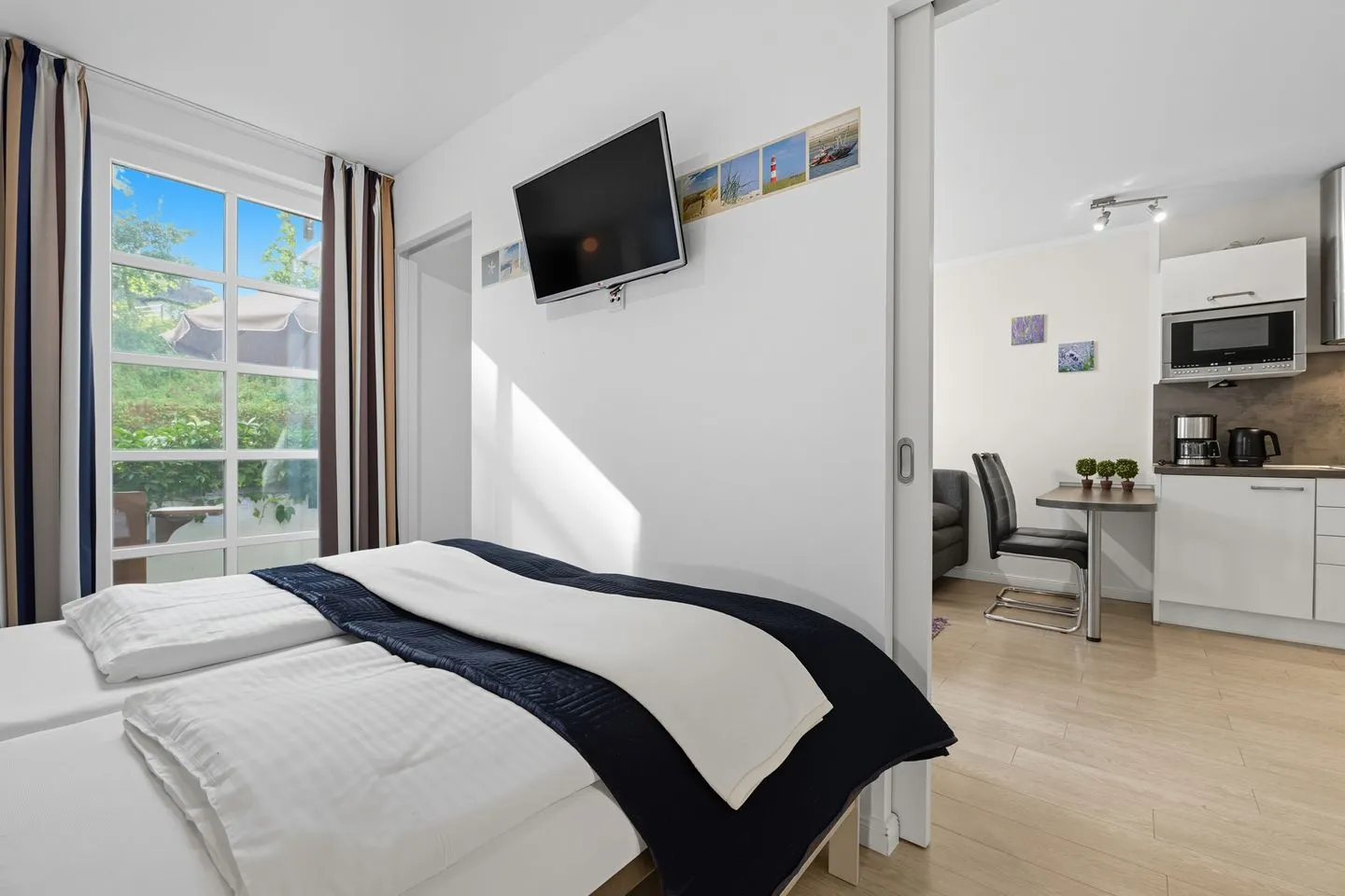 Unsere helle und freundliche Ferienwohnung bietet Platz für bis zu 2 Personen und besticht durch einen großzügigen Wohn- und Essbereich sowie ein behagliches Schlafzimmer. Die moderne und hochwertige Einbauküche lädt dazu ein, kulinarische Genüsse zu zaubern und gemütliche Abende zu verbringen.