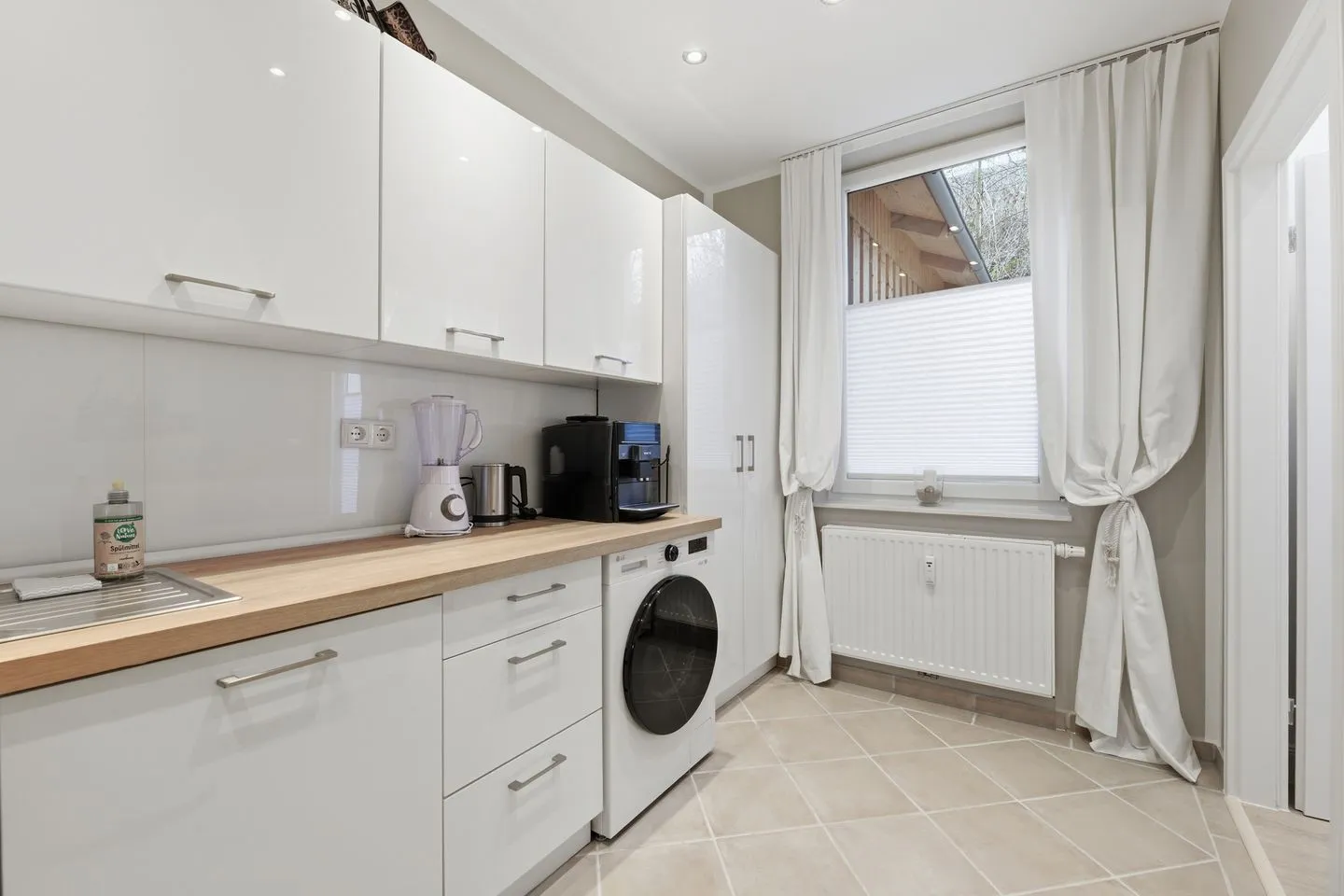 Das Badezimmer verfügt über eine bodengleiche Dusche, Waschbecken, WC, Spiegel, Haartrockner und warmes Wasser. Bettwäsche, Handtücher, Badetücher und Bademäntel sind vorhanden. Für zusätzlichen Komfort sorgen Waschmaschine, Bügeleisen, Bügelbrett, Wäscheständer, Staubsauger, Ganzkörperspiegel, Fliegengitter, Garderobe, Heizung mit Zentralheizung und Fußbodenheizung sowie Sichtschutz an allen Fenstern.