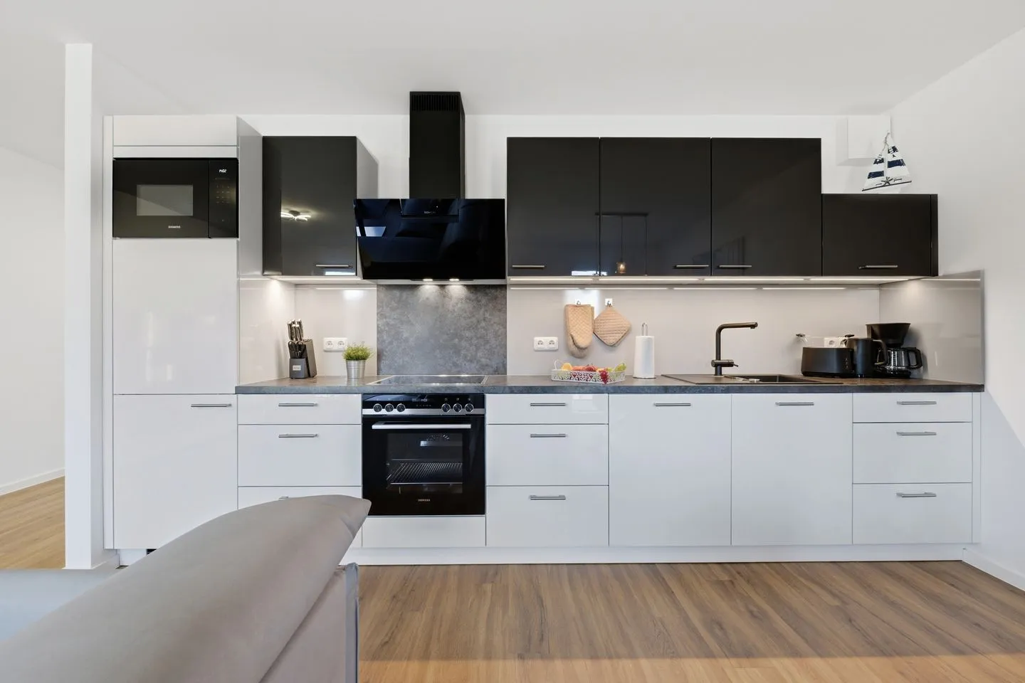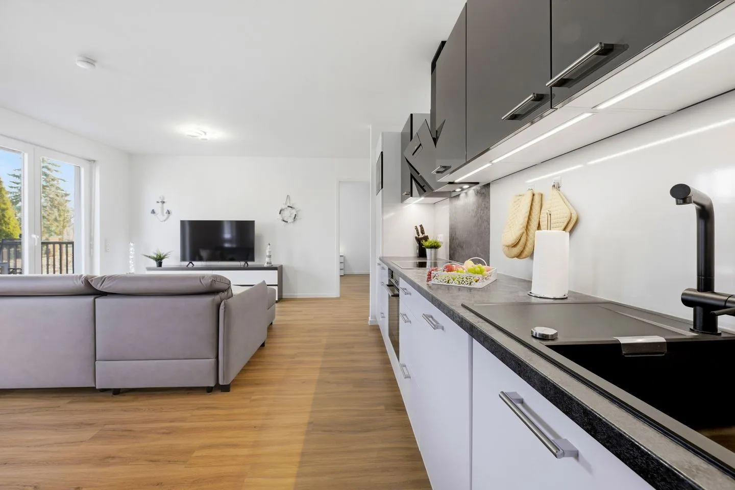 Der Wohnbereich ist offen gestaltet und verbindet Wohnen, Essen und Küche zu einem angenehmen Mittelpunkt Ihres Aufenthalts. Eine Sofaecke, ein Esstisch sowie ein TV sorgen für entspannte Stunden. Internet und WLAN sind vorhanden, sodass Sie auch im Urlaub gut verbunden bleiben.