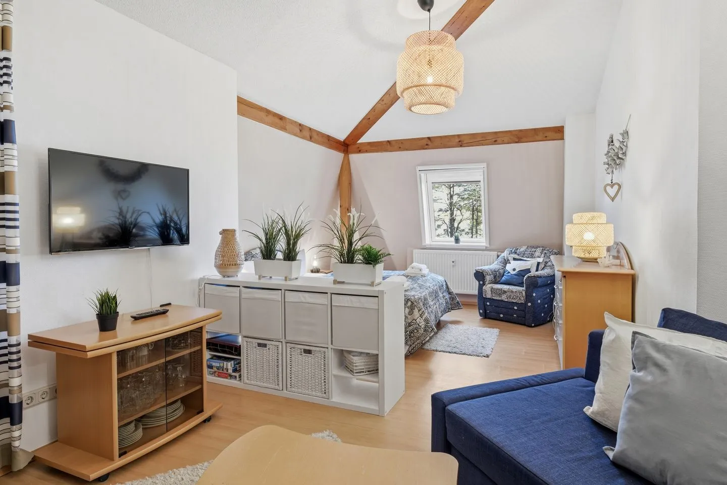 Im Wohn-/Schlafraum erwarten Sie ein Doppelbett, eine ausziehbare Couch und ein Essplatz mit Balkonzugang. Die Südausrichtung sorgt für eine helle Atmosphäre.