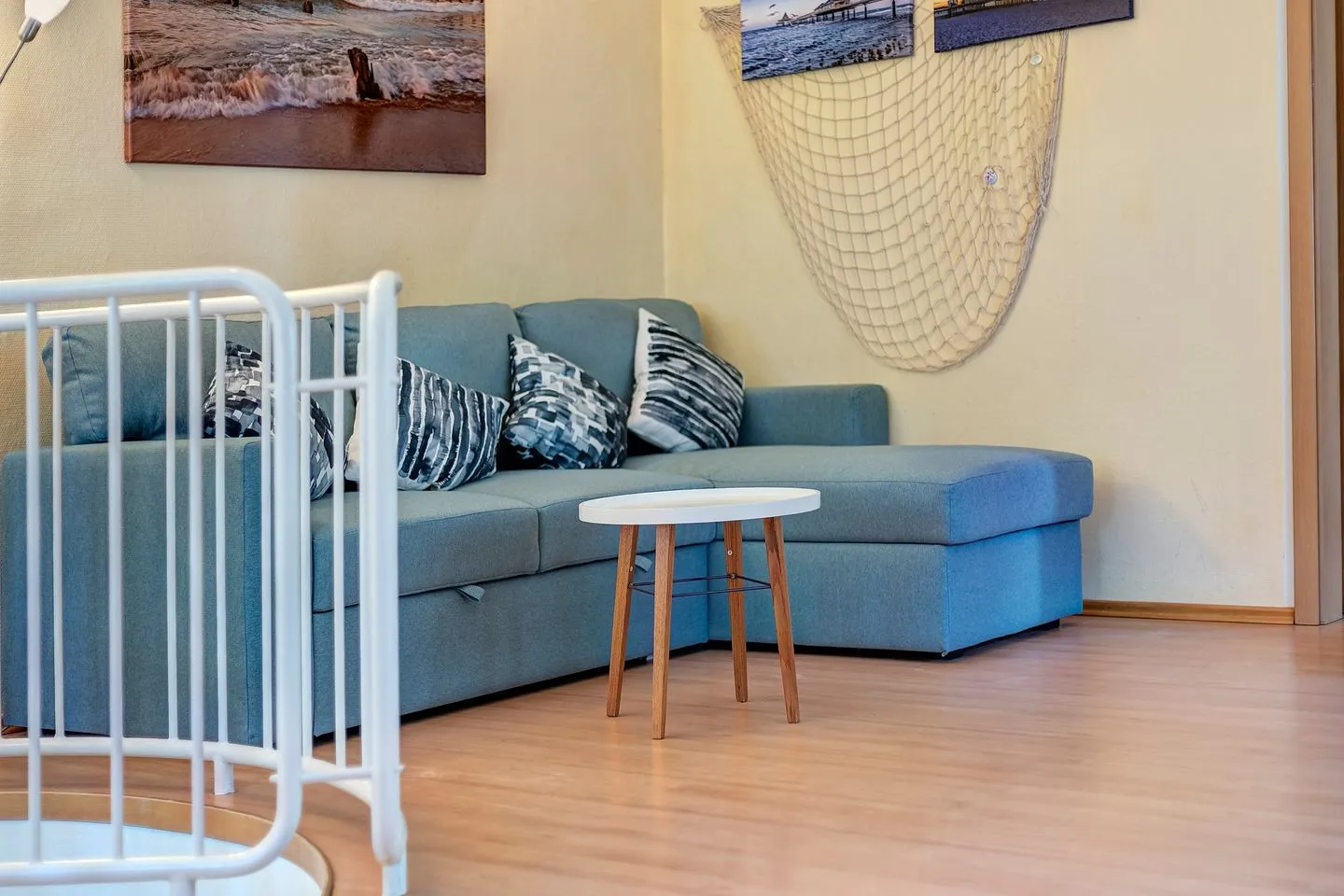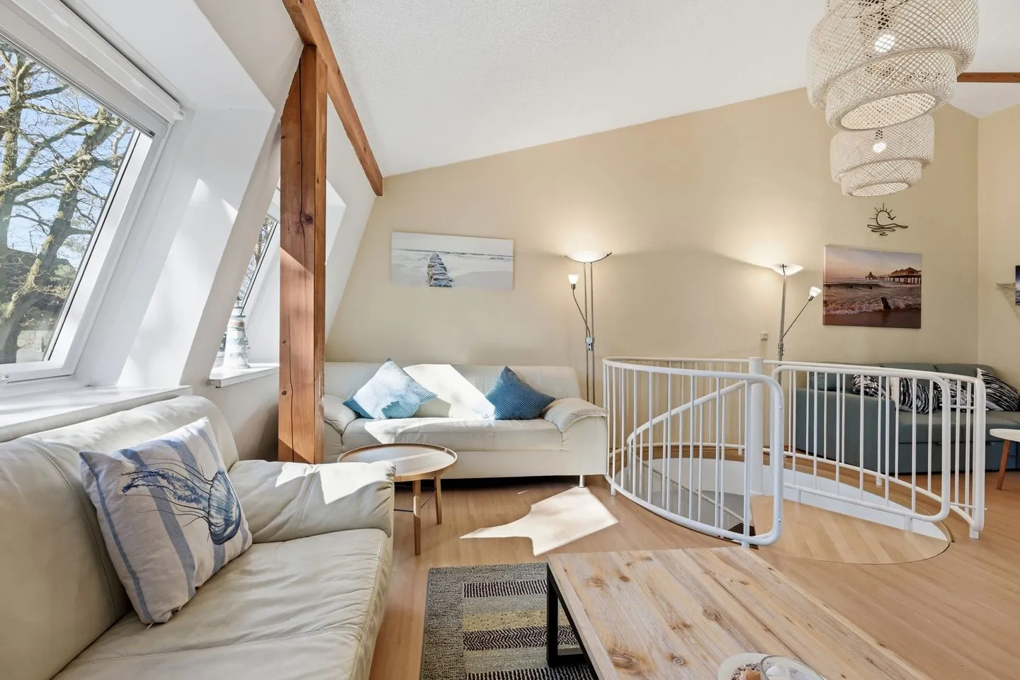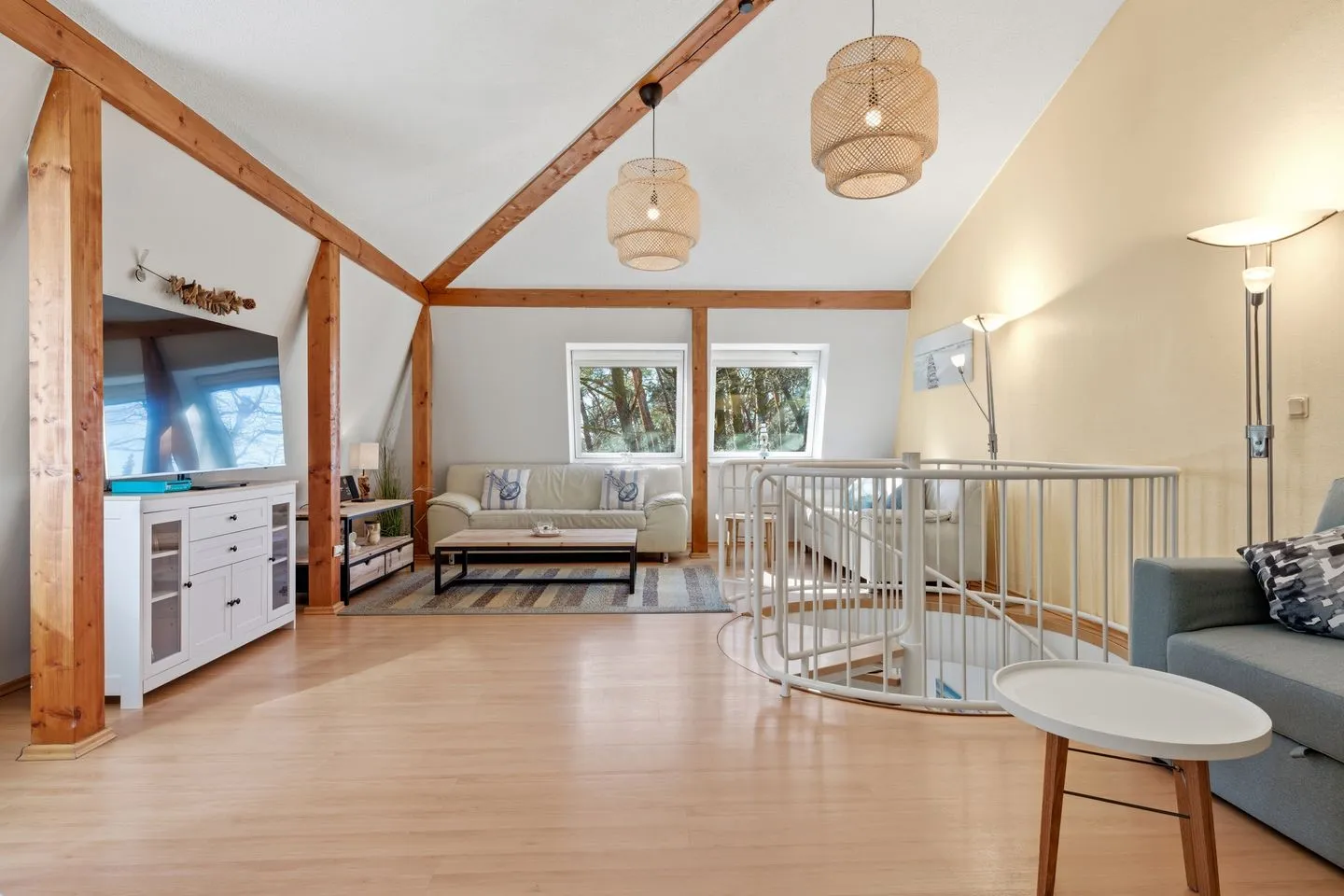 Die Aufteilung der Maisonettewohnung ist komfortabel gelöst: Neben einem separaten Schlafzimmer mit Laminatboden erwartet Sie ein lichtdurchflutetes Wohnzimmer mit gemütlicher Sofaecke und weiteren durchdachten Ausstattungsdetails wie Kommode, Staubsauger und vollständigem Sichtschutz an allen Fenstern. Im Essbereich genießen Sie gesellige Mahlzeiten am Esstisch – passend auch für längere Aufenthalte.
