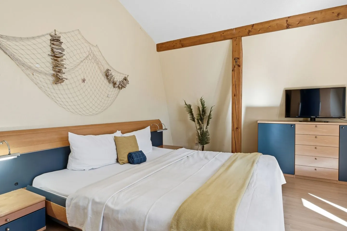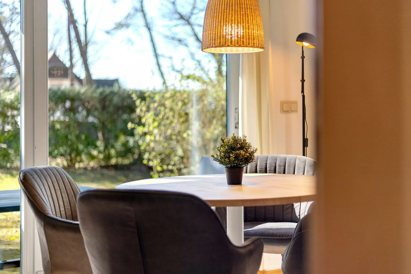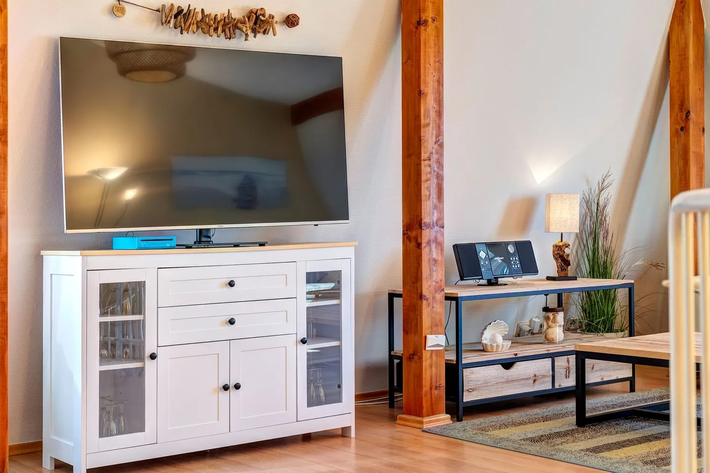 Die Aufteilung der Maisonettewohnung ist komfortabel gelöst: Neben einem separaten Schlafzimmer mit Laminatboden erwartet Sie ein lichtdurchflutetes Wohnzimmer mit gemütlicher Sofaecke und weiteren durchdachten Ausstattungsdetails wie Kommode, Staubsauger und vollständigem Sichtschutz an allen Fenstern. Im Essbereich genießen Sie gesellige Mahlzeiten am Esstisch – passend auch für längere Aufenthalte.