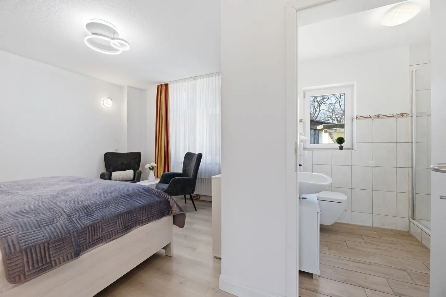 Willkommen in Ihrem kleinen Rückzugsort: Dieses Ferienzimmer im Erdgeschoss empfängt Sie mit seiner hellen, freundlichen Atmosphäre und modern eingerichtetem Wohn- und Schlafbereich in einem kombinierten Raum. Hier finden Sie alles, was Sie für einen angenehmen Aufenthalt brauchen inklusive praktischer Utensilien für die Zubereitung von Kaffee und Tee, ideal für den Start in einen entspannten Urlaubstag. Das moderne Bad mit Dusche und WC sorgt für zusätzlichen Komfort. Ob für ein Wochenende zu zweit oder einen Kurzurlaub allein – dieses behagliche Zimmer bietet Ihnen Ruhe, Erholung und ein stilvolles Ambiente in historischem Umfeld.
