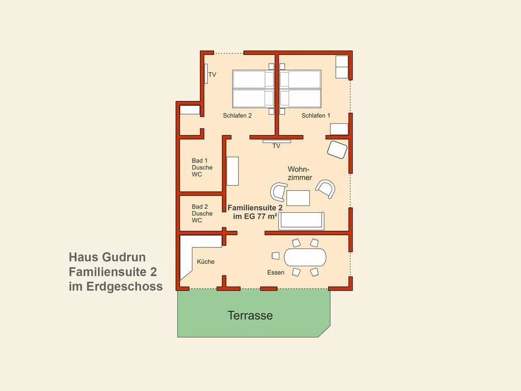 Willkommen in unserer Familiensuite 2, frisch modernisiert und hochwertig ausgestattet. Diese großzügige Unterkunft verbindet elegantes Ambiente mit kompromisslosem Wohnkomfort, perfekt für entspannte Tage mit der ganzen Familie.