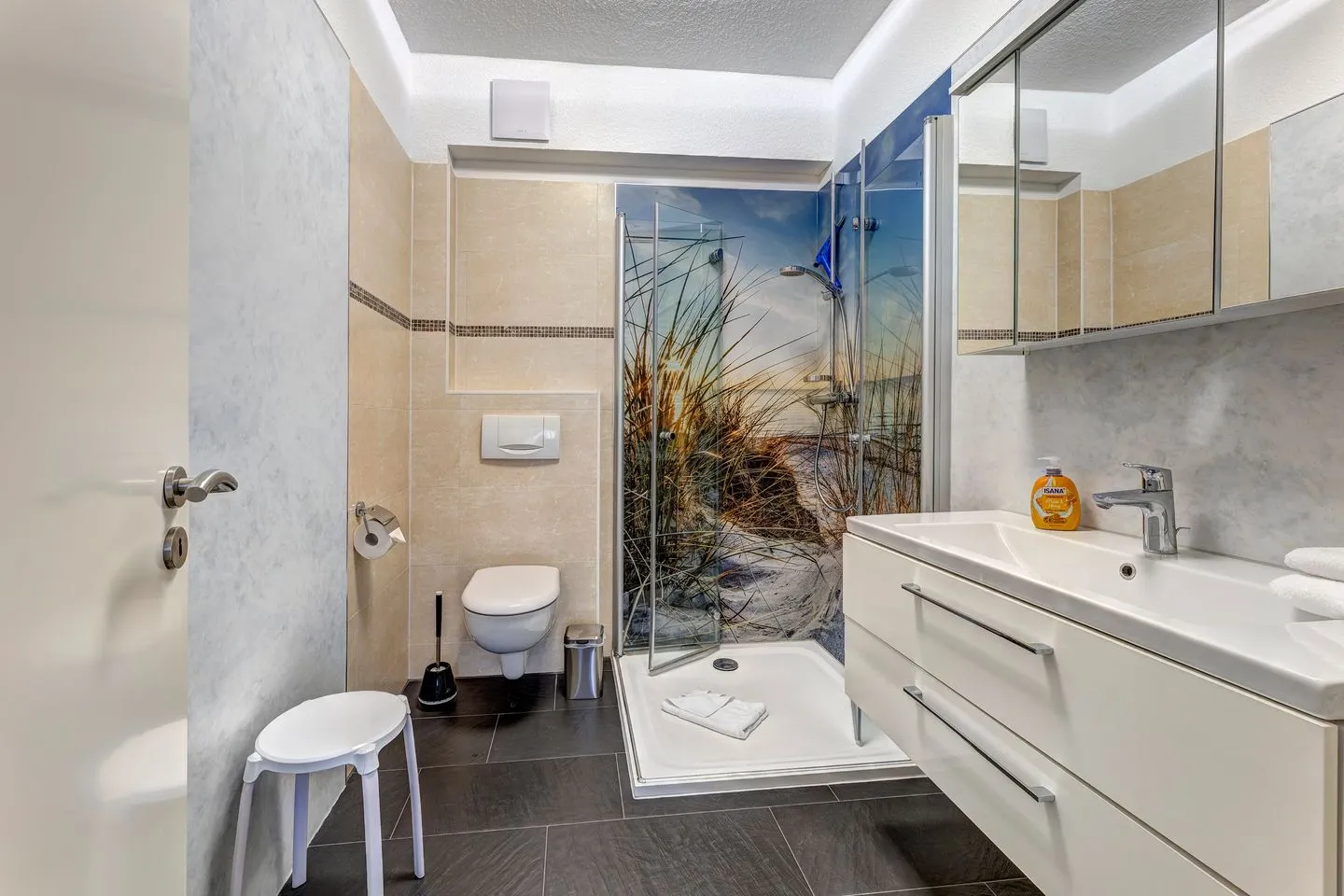 Zwei behagliche Schlafzimmer mit komfortablen Doppelbetten garantieren erholsame Nächte. Das Hauptschlafzimmer beeindruckt mit begehbarem Kleiderschrank (offene Regale) und eigenem Bad mit Dusche und WC. Ein weiteres Bad mit Dusche und WC sorgt zusätzlich für Komfort.