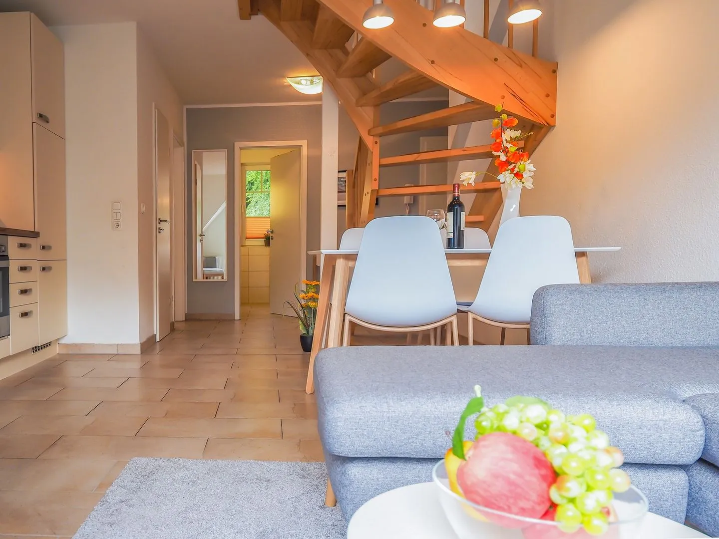 Der Wohnraum strahlt Helligkeit und Wärme aus, mit einer integrierten Einbauküche und einem einladenden Essbereich. Hier können Sie gemeinsam kochen und genießen, während Sie den Tag Revue passieren lassen. Das angrenzende Schlafzimmer ist mit einem komfortablen Doppelbett ausgestattet, um Ihnen erholsame Nächte zu ermöglichen.