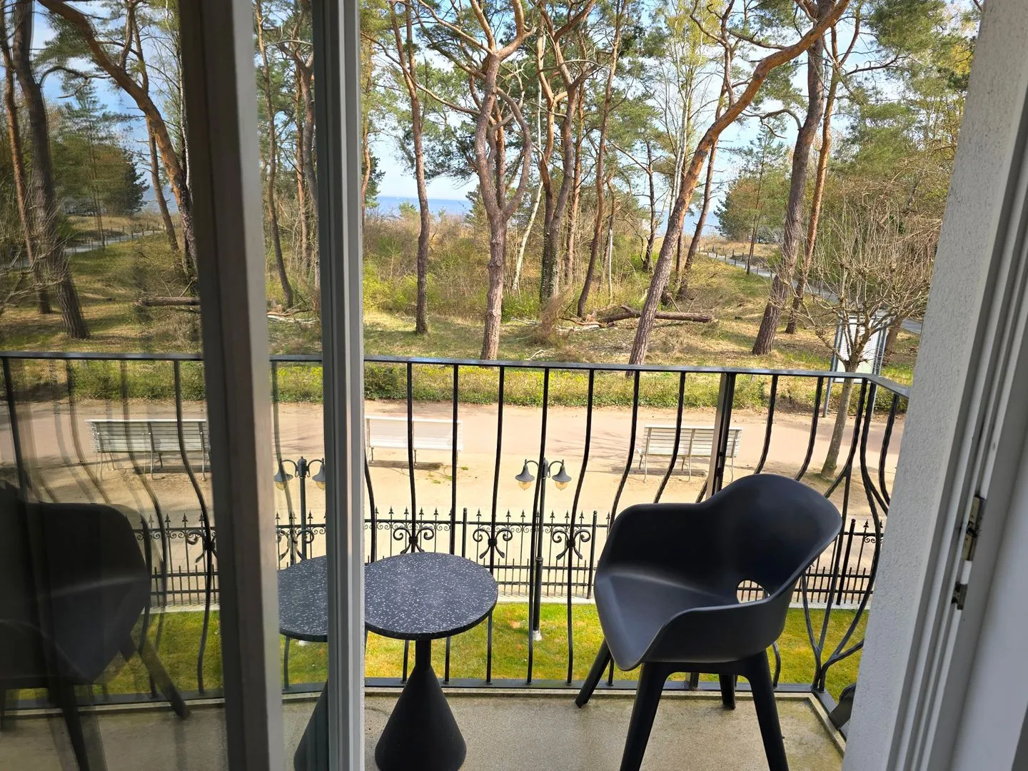 Die Ostsee kann man durch die wunderschönen, pinienartigen Strandkiefern hindurch glitzern sehen und der Blick vom Balkon auf die Promenade ist immer interessant.