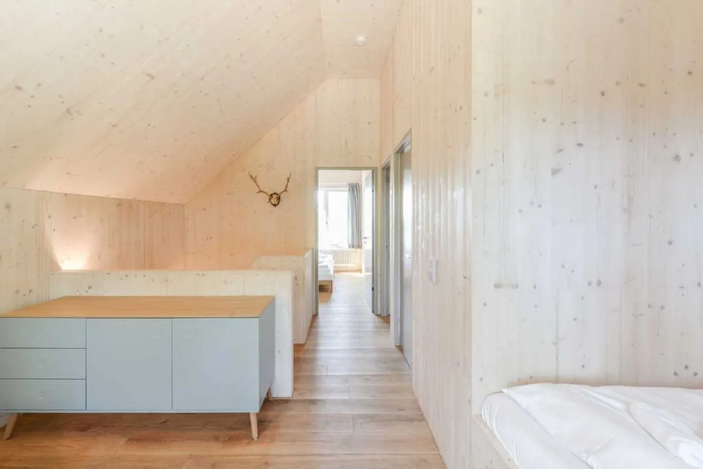 Im Dachgeschoss befinden sich zwei Schlafzimmer mit jeweils einem Doppelbett oder zwei Einzelbetten, von denen Sie den wunderschönen Blick zum Kölpinsee genießen. Im dritten Schlafzimmer finden Sie Erholung im gemütlichen Doppelbett, das in einer Schlafkoje verbaut wurde und in der zur Diele offenen Galerie einen Blick auf die grüne Umgebung bietet. Für einen weiteren Gast wird der komfortable Schlafsessel zu einem Einzelbett ausgeklappt.