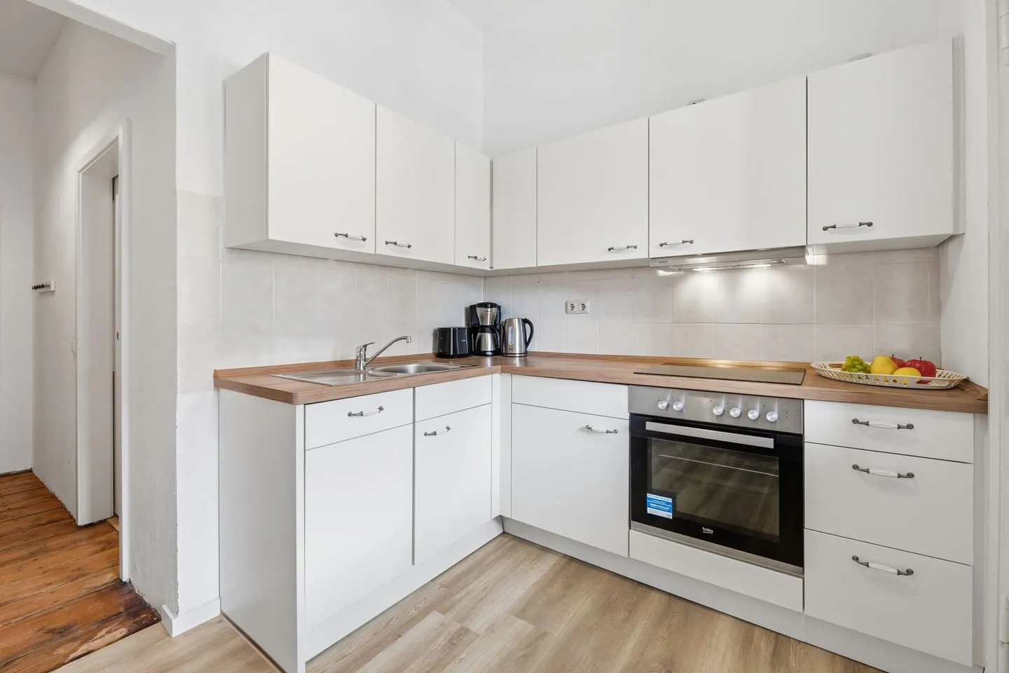 Die komplett eingerichtete Küche beeindruckt mit einem Herd, einem Kühlschrank samt Gefrierfach, einer praktischen Spüle sowie einer Kaffeemaschine und einem Wasserkocher. Hier können Sie Ihre kulinarischen Kreationen zaubern und sich wie zuhause fühlen. Das großzügige Badezimmer mit Dusche und WC verspricht Erfrischung und Komfort.